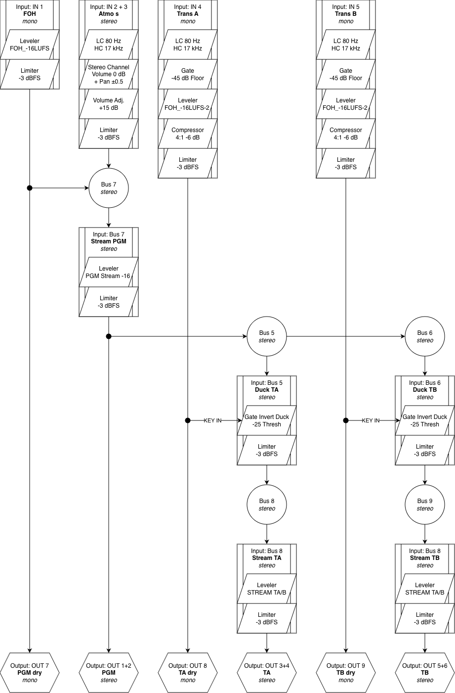 Hier werden Translator dry und der jeweils geduckte Stream PGM gemischt. Ein sehr langsamer Leveler hebt das PGM etwas an, wenn die Translator Pause machen. Ein Limiter sitzt am Ende.